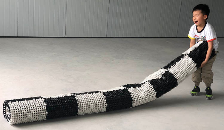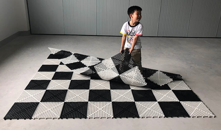 La scacchiera è composta da caselle di 30x30 cm, che vengono assemblati in un unico insieme per mezzo di speciali bottoni automatici. Poiché la scacchiera è ignifuga è costituito da una speciale rete di gomma, è resistente al 100% alle intemperie.