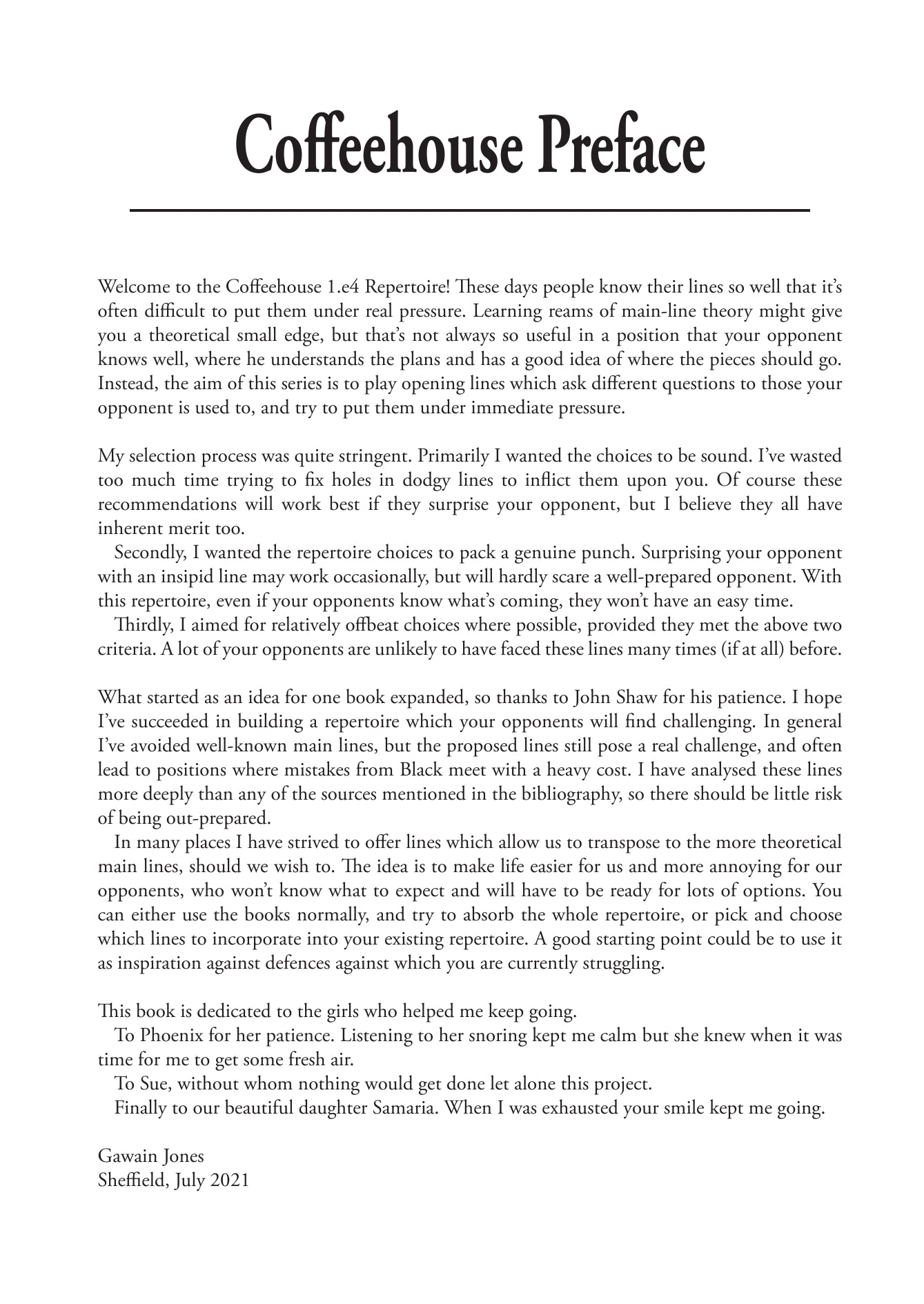 Coffeehouse Repertoire è il sogno di tutti i giocatori di 1.e4: un arsenale di idee di un grande maestro di fama mondiale per sorprendere e confondere gli avversari, combinando i trucchi del caffè con una completa solidità teorica.