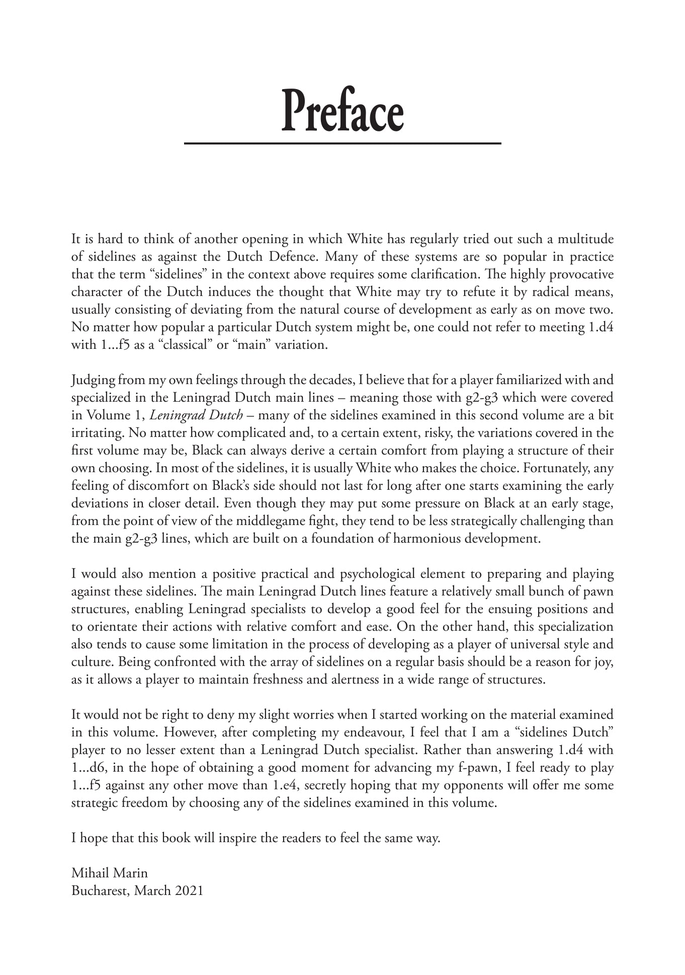L'Olandese è una delle risposte più ambiziose del Nero a 1.d4, poiché con 1...f5 il Nero crea un gioco asimmetrico e ricco di complessità. Mihail Marin è l'autore ideale per spiegare sia le idee strategiche che la teoria più recente.