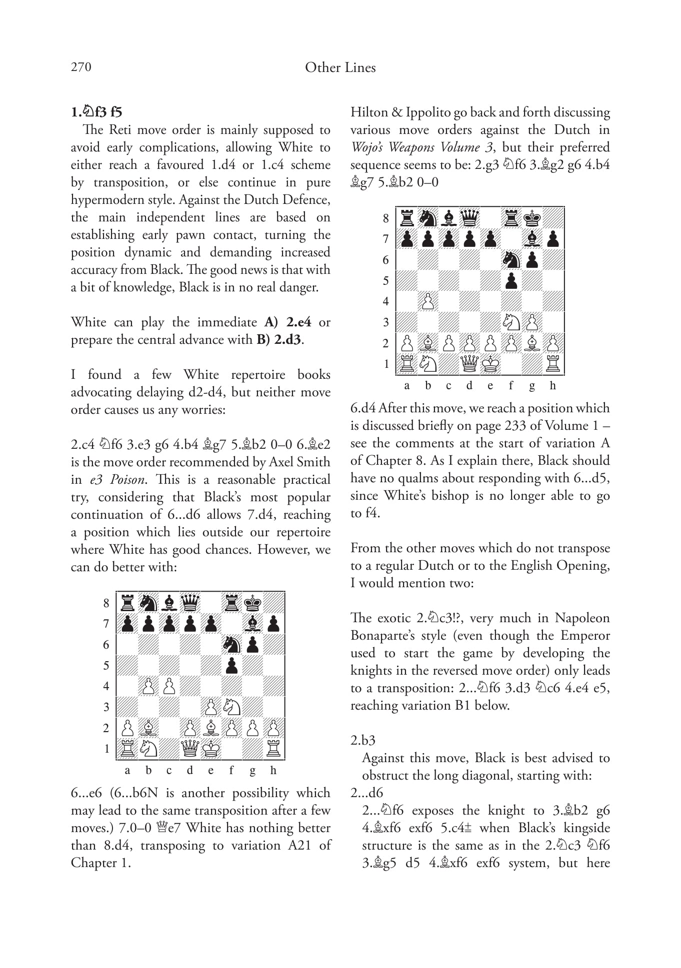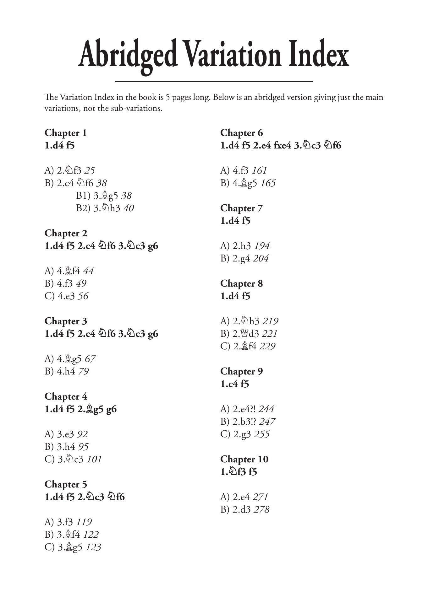 Dutch Sidelines copre le linee in cui il Bianco non fiancheggia l'alfiere del Re. Queste includono le linee 1.d4 f5 2.c4, così come le opzioni anti-olandesi come 2.Bg5, 2.Nc3 e vari gambit. Inoltre, l'autore offre un'ampia guida su come affrontare 1.Nf3 e 1.c4 in stile olandese. Il volume di accompagnamento, Olandese di Leningradoè la pietra miliare del repertorio olandese del Nero.