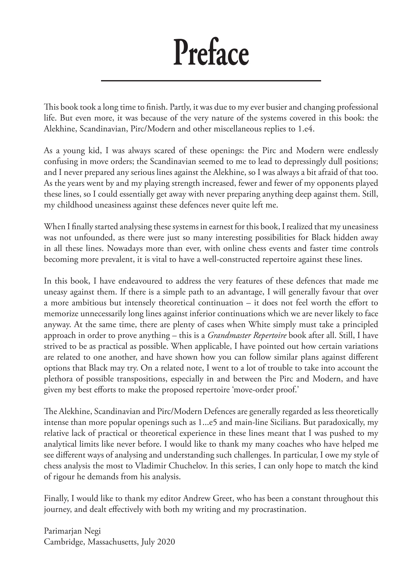 Il quinto volume della serie Grandmaster Repertoire - 1.e4 offre un repertorio di altissimo livello contro le difese Alekhine, Scandinava, Pirc e Moderna, oltre a varie alternative fuori dagli schemi che il Nero può tentare. L'ultimo lavoro di Negi continua la formula vincente dei suoi libri precedenti: il repertorio 1.e4 è fondato su linee principali consolidate e potenziato con le idee innovative di un teorico di livello mondiale, che lo rendono un'aggiunta essenziale alla biblioteca di ogni giocatore ambizioso.