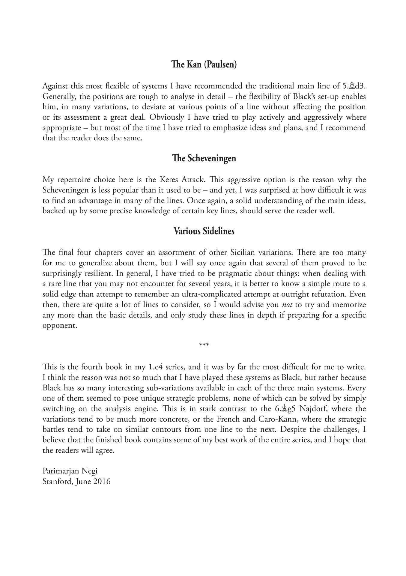 Il quarto volume della serie Grandmaster Repertoire - 1.e4 offre un repertorio di altissimo livello contro i sistemi Taimanov, Kan e Scheveningen, oltre a tutte le altre linee siciliane non trattate nei volumi precedenti. Negi riprende le linee principali consolidate e le arricchisce con le sue idee innovative, rendendo il repertorio un incubo per i giocatori siciliani e un'aggiunta essenziale alla biblioteca di ogni giocatore ambizioso.