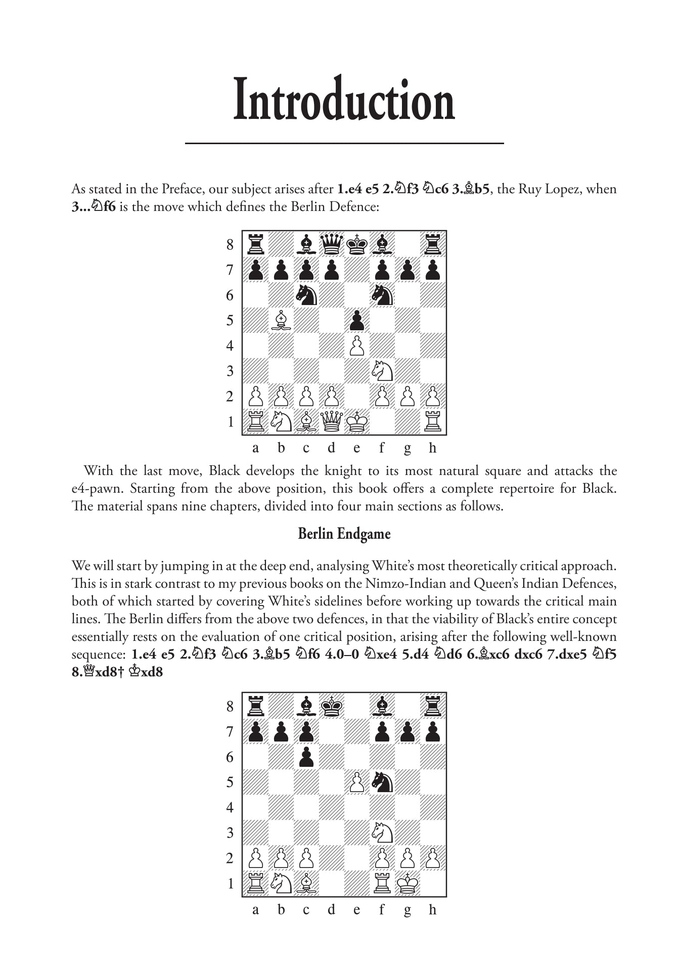 Ogni giocatore che incontra 1.e4 con 1...e5 ha bisogno di una risposta affidabile alla Ruy Lopez, e la Difesa di Berlino è la soluzione ideale. Da quando Vladimir Kramnik ha usato la Berlin per bloccare i migliori sforzi di Garry Kasparov nel loro incontro al Campionato del Mondo del 2000, praticamente tutti i migliori giocatori del mondo hanno incorporato con successo il "muro di Berlino" nel loro repertorio.