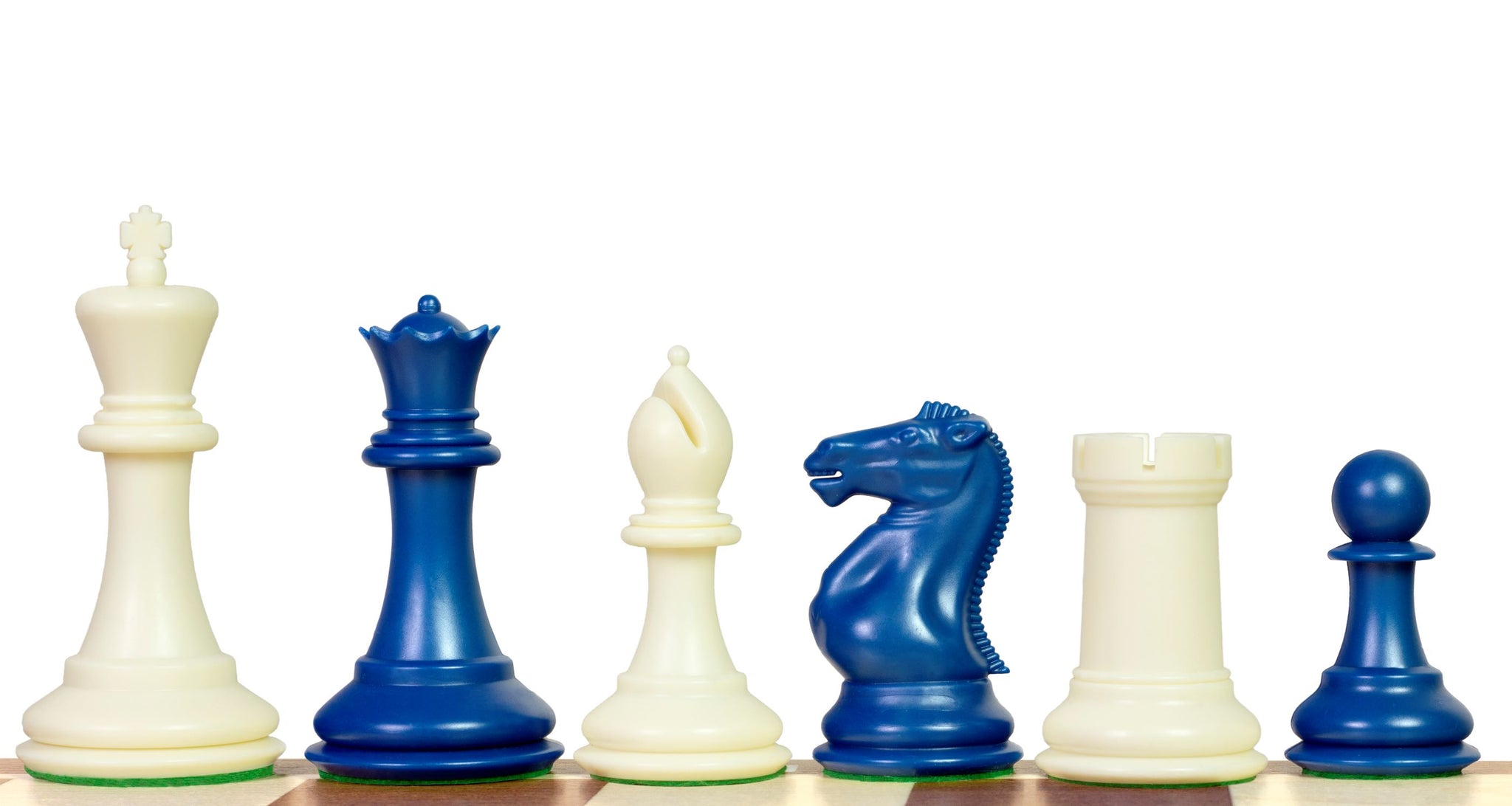 Esclusive figure di scacchi Staunton n. 6, bianco/blu, con peso in metallo (re 95 mm)