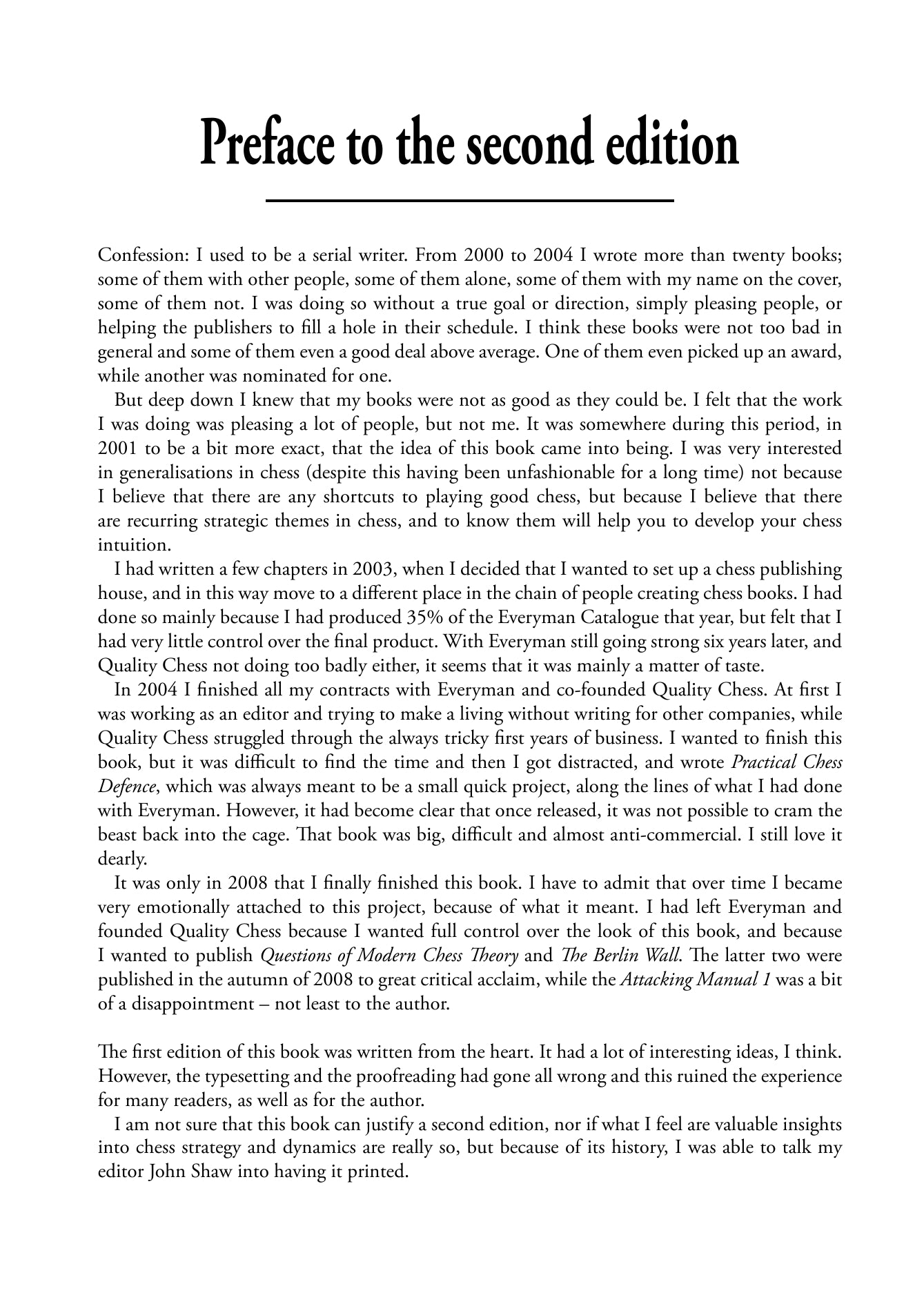 Potrebbe sembrare un po' strano vedere nuove edizioni [del Manuale di Attacco 1] così presto. La prassi normale è quella di aspettare che la tiratura sia esaurita e poi far passare un po' di tempo, ma in questo caso il GM Aagaard, uno dei comproprietari della casa editrice Quality Chess, era insoddisfatto delle qualità fisiche dei libri (l'impaginazione e la rilegatura) e di alcuni refusi nel primo volume. Molti lettori non avrebbero notato questi difetti, ma per Aaagard, un autore molto apprezzato che considera i Manuali d'attacco 1 e 2 come il suo lavoro migliore, erano inaccettabili. Il primo volume, Manuale d'attacco 1, ha ora un'impaginazione più facile da usare, con margini generosi in alto e in basso, una rilegatura eccezionalmente bella che permette al libro di rimanere aperto da solo quando si studia e non ci sono più errori di battitura. Attacking Manual 1 è inoltre più lungo di sessanta pagine rispetto alla prima edizione.