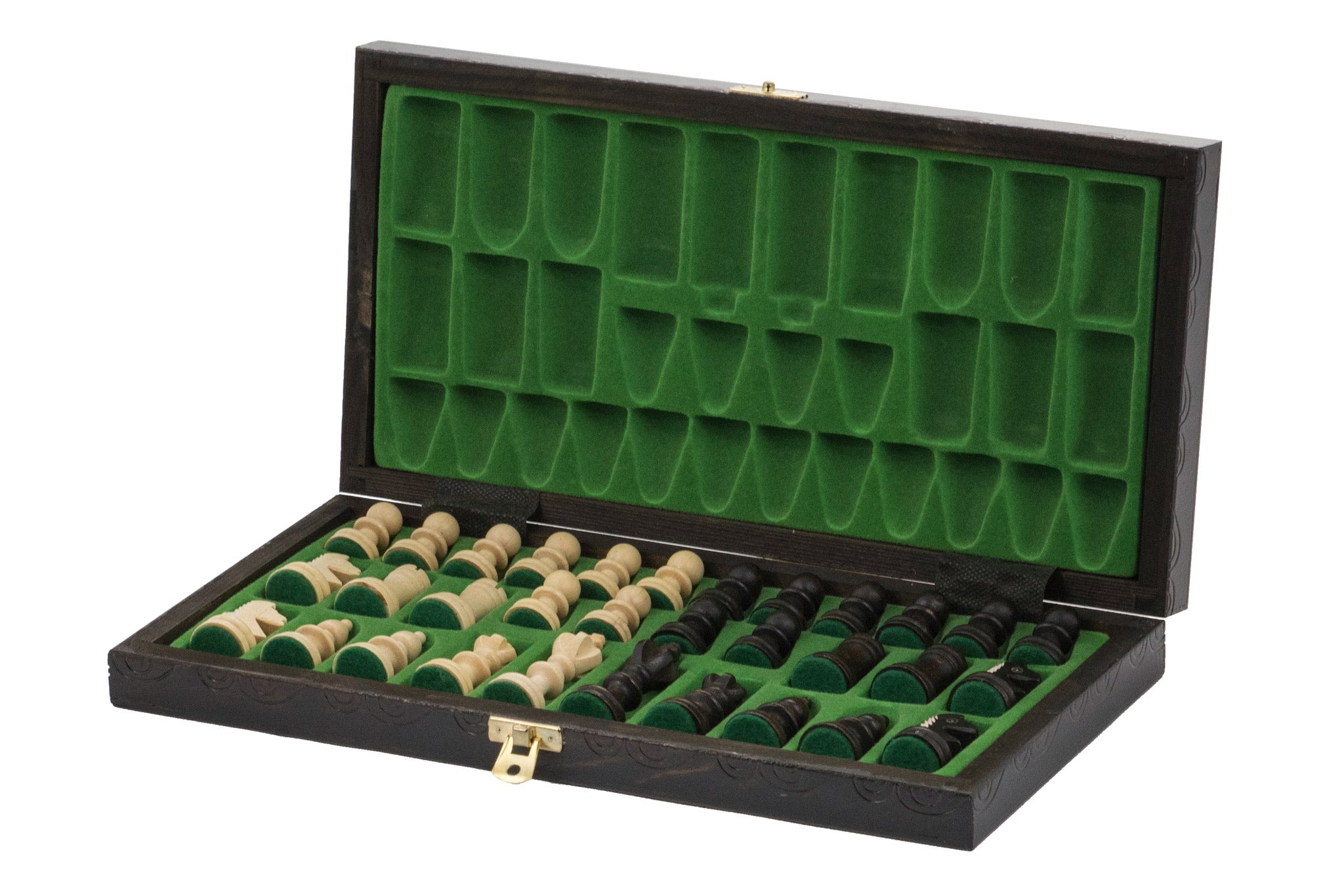 Le figure sono realizzate in carpino e faggio. La valigetta degli scacchi cotta e semipiegabile è stata dotata di un inserto per riporre facilmente le figure.