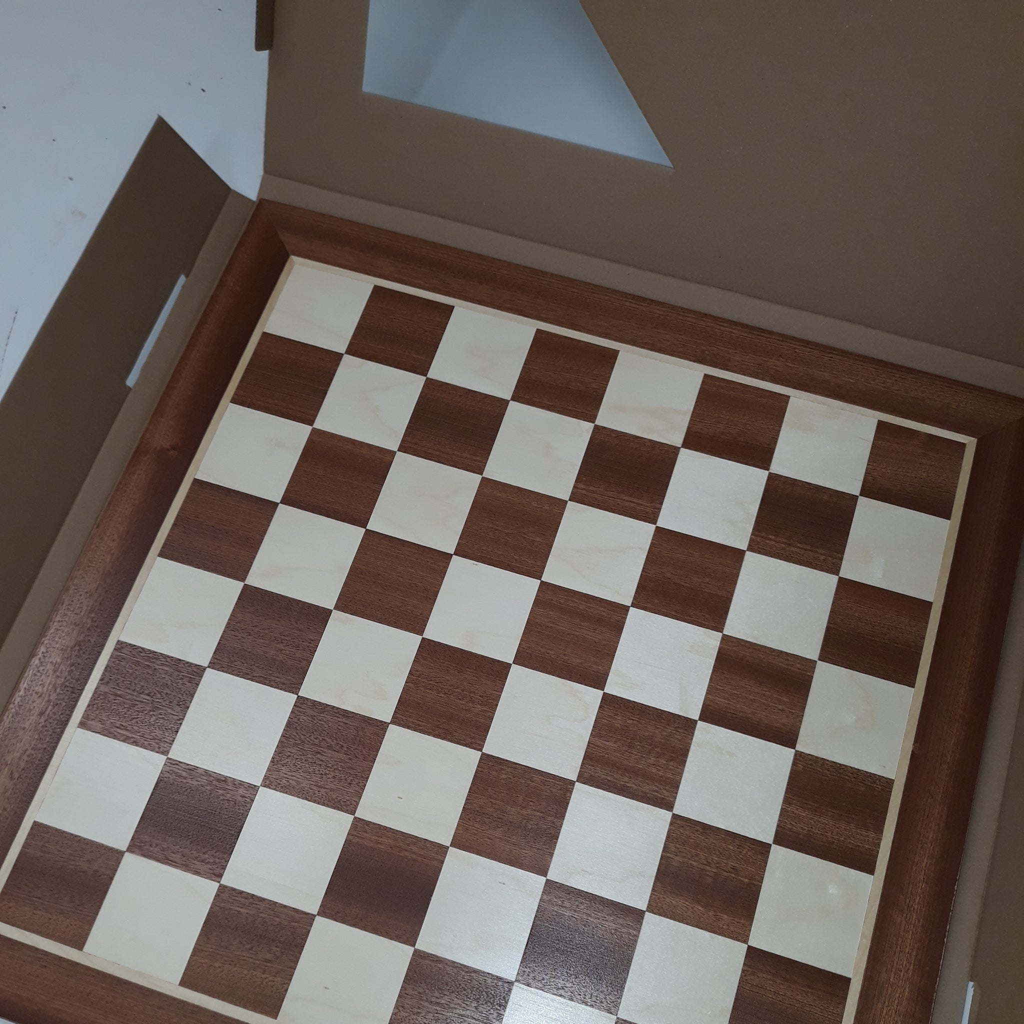 Scacchiera+damasco francese rifinito con intarsi in mogano e sicomoro dimensioni 54x54 cm. Questa magnifica scacchiera con campi di 55 mm è ideale per le nostre figure più grandi con un'altezza del re di 98 mm. Sul lato del damasco francese, la tavola ha 10x10 campi di 40 mm.