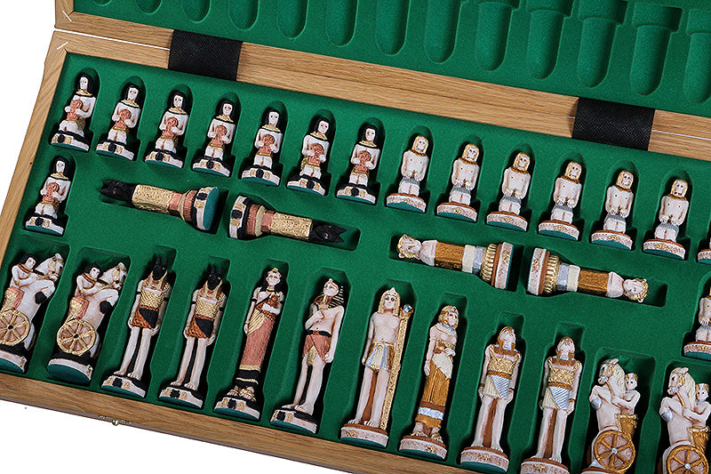 Il set EGITTO è composto da figure di scacchi in farina di marmo dipinte a mano e incollate con resina e da una scacchiera bianco e marrone è bianco e marrone e comoda da trasportare. Con una dimensione del campo di 58 mm.