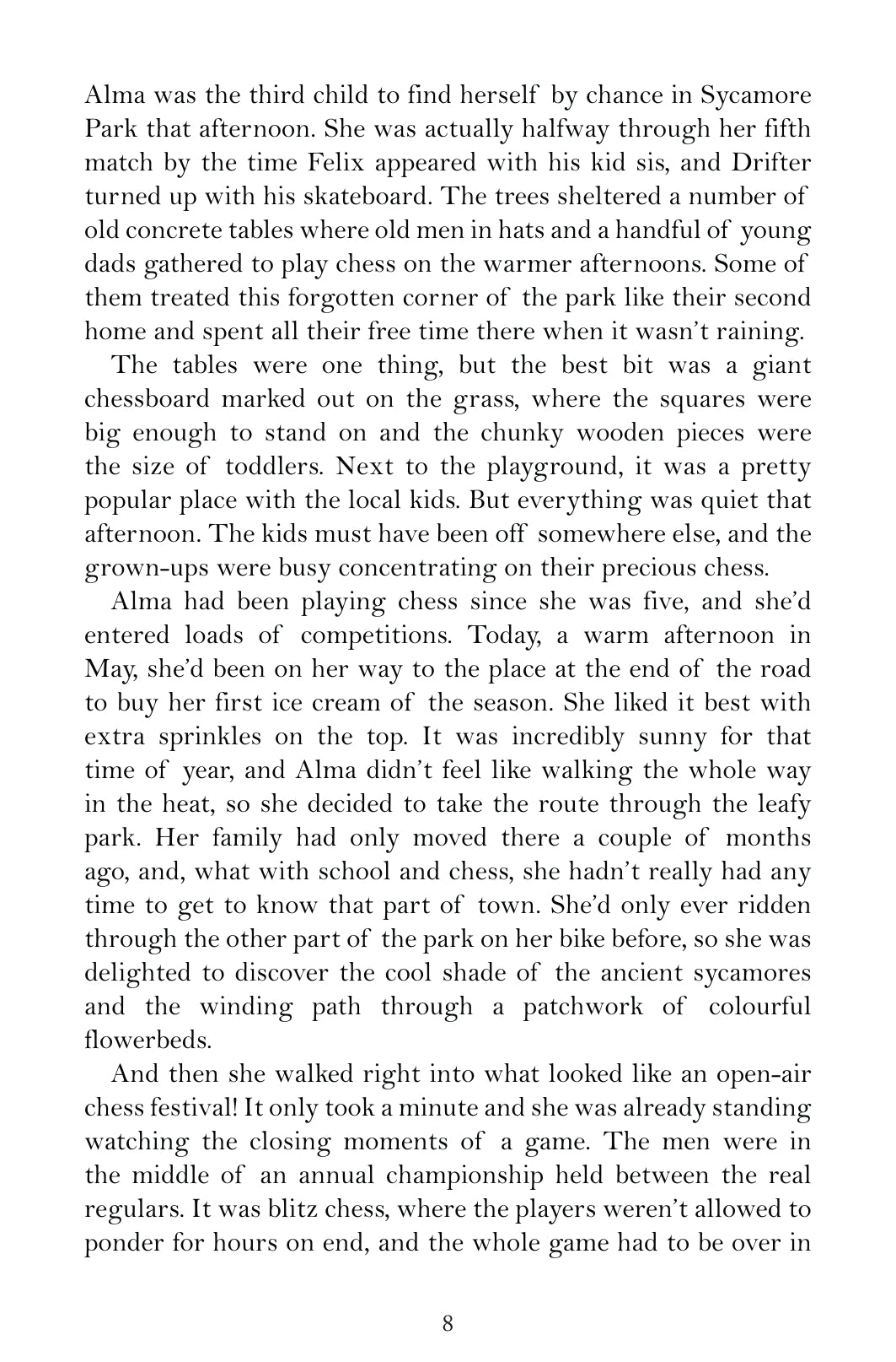 Per godersi questo libro non è necessario saper giocare a scacchi, come non lo sanno i compagni di Alma. Ma senza il loro aiuto, Alma sarebbe destinata a fallire...