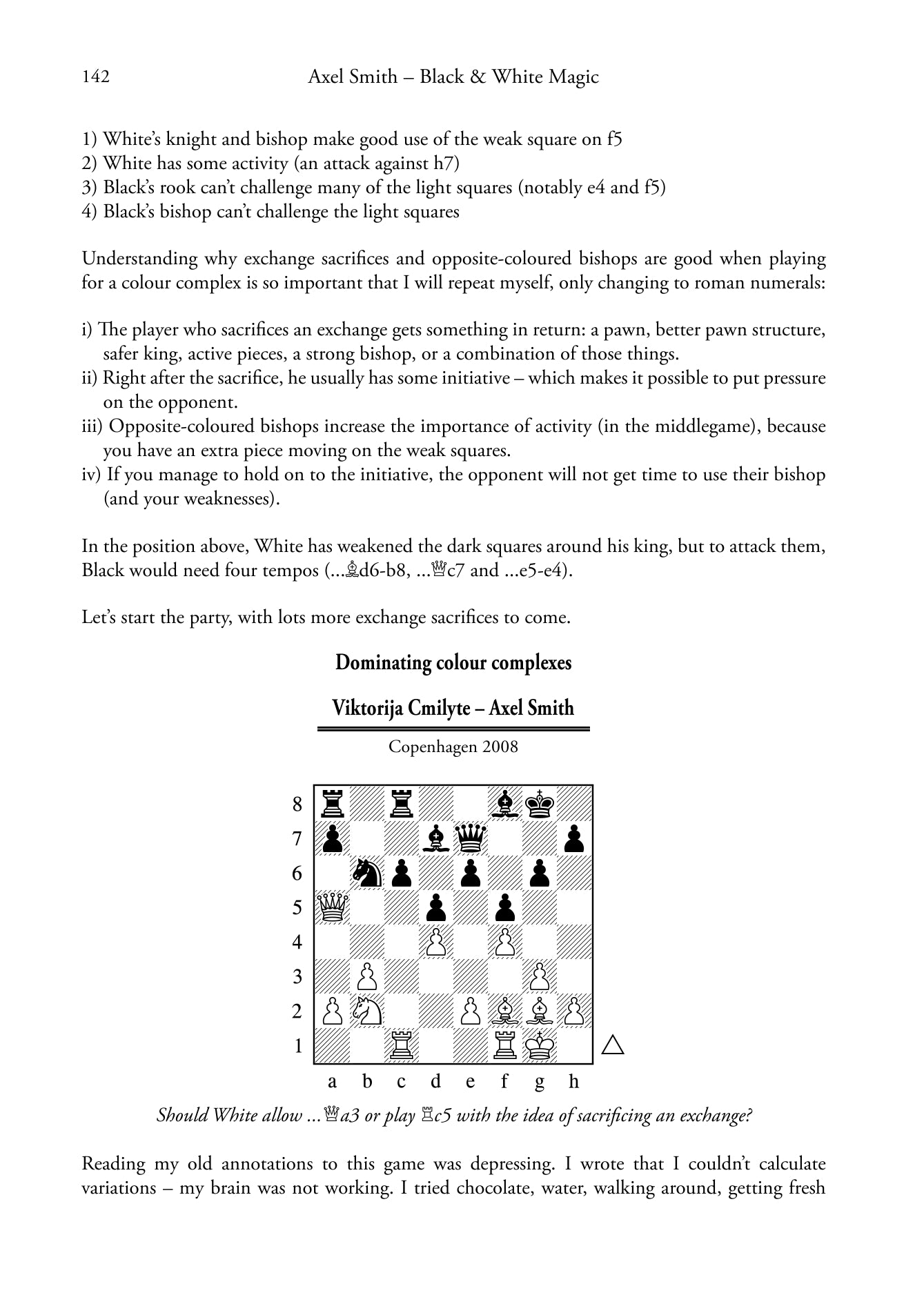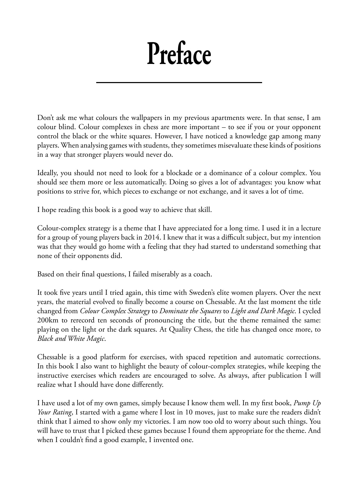 Durante il suo lungo percorso di giocatore e allenatore di scacchi, il GM Axel Smith si è reso conto che la comprensione delle strategie dei complessi cromatici è una delle differenze fondamentali tra giocatori forti e deboli. Dopo molti anni di lezioni e materiale didattico per i suoi studenti, Smith ha prodotto un corso Chessable sull'argomento, che è stato ampiamente modificato e riorganizzato da Quality Chess per produrre questo libro.