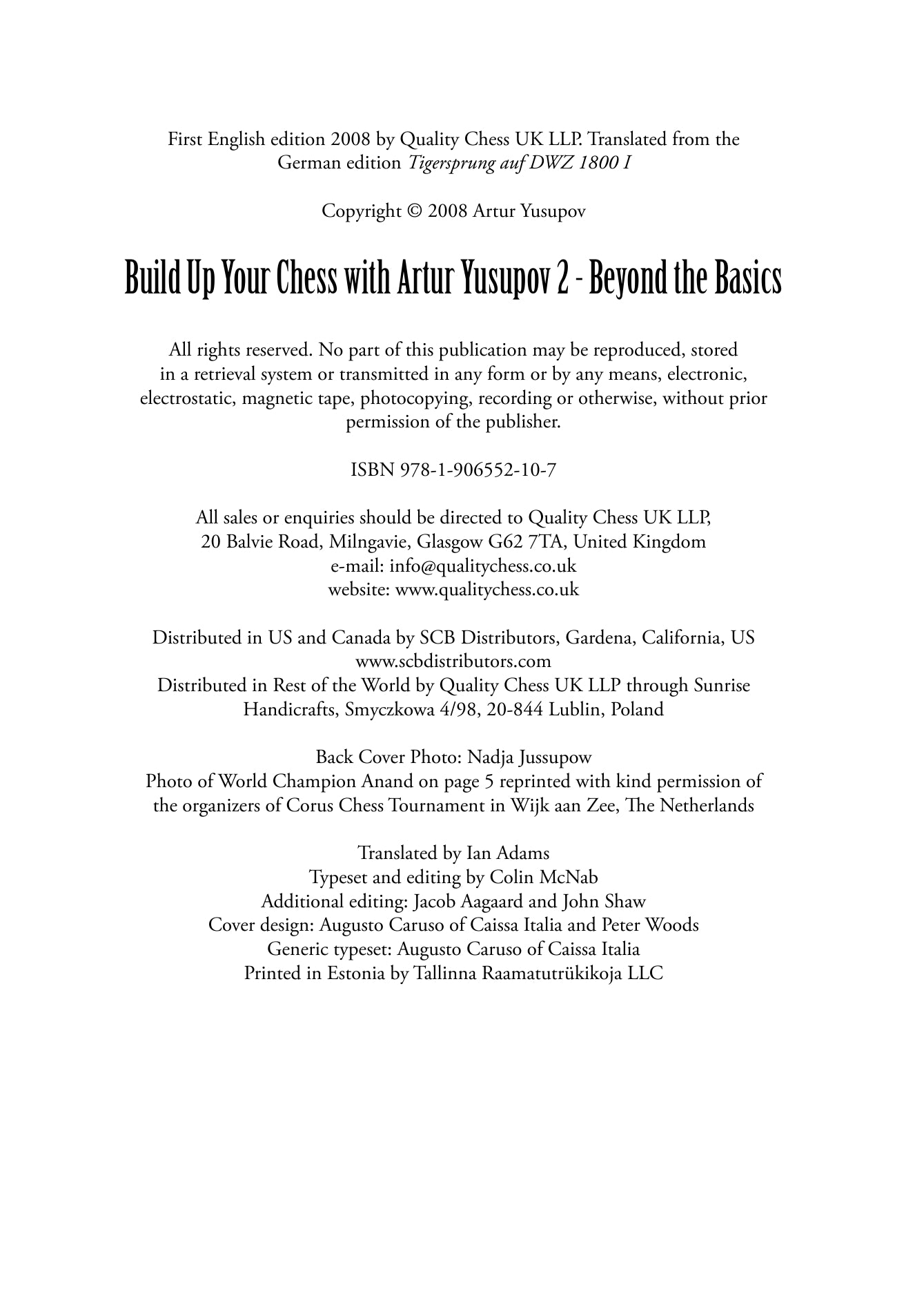 Il famoso insegnante di scacchi e gran maestro Artur Yusupov continua il suo corso completo di miglioramento degli scacchi. Il primo volume, I fondamenti, ha mostrato ai giocatori di scacchi del club le idee di base che dovrebbero conoscere. Ora il volume 2, Oltre le basi, si avvia sulla strada della maestria. Yusupov guida il lettore verso un livello superiore di comprensione degli scacchi utilizzando posizioni e consigli accuratamente selezionati. Questa nuova comprensione viene poi messa alla prova da una serie di rompicapi.