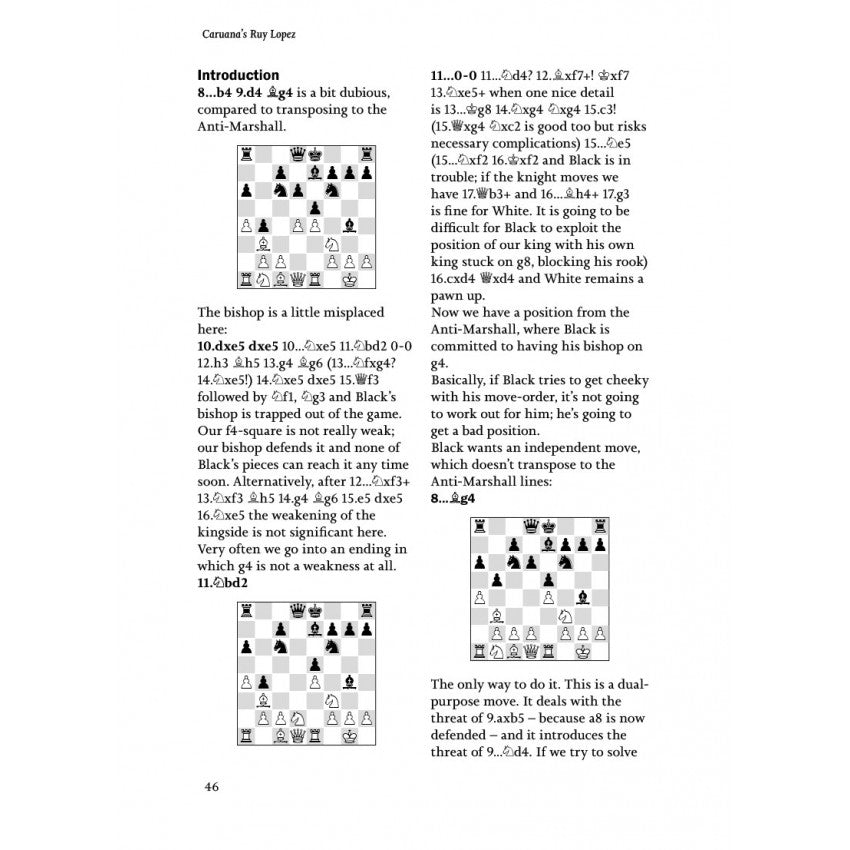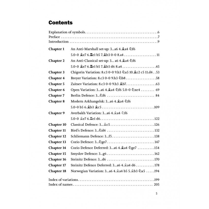 Questo repertorio in un unico volume e di facile comprensione copre quindici varianti principali, dalle linee classiche all'anti-Marshall (8.a4), dalla Schliemann (3...f5) alla Steinitz moderna. In modo facile da comprendere, Caruana spiega le caratteristiche generali, come i punti deboli permanenti e gli obiettivi a lungo termine, e cerca sempre un vantaggio per il bianco.