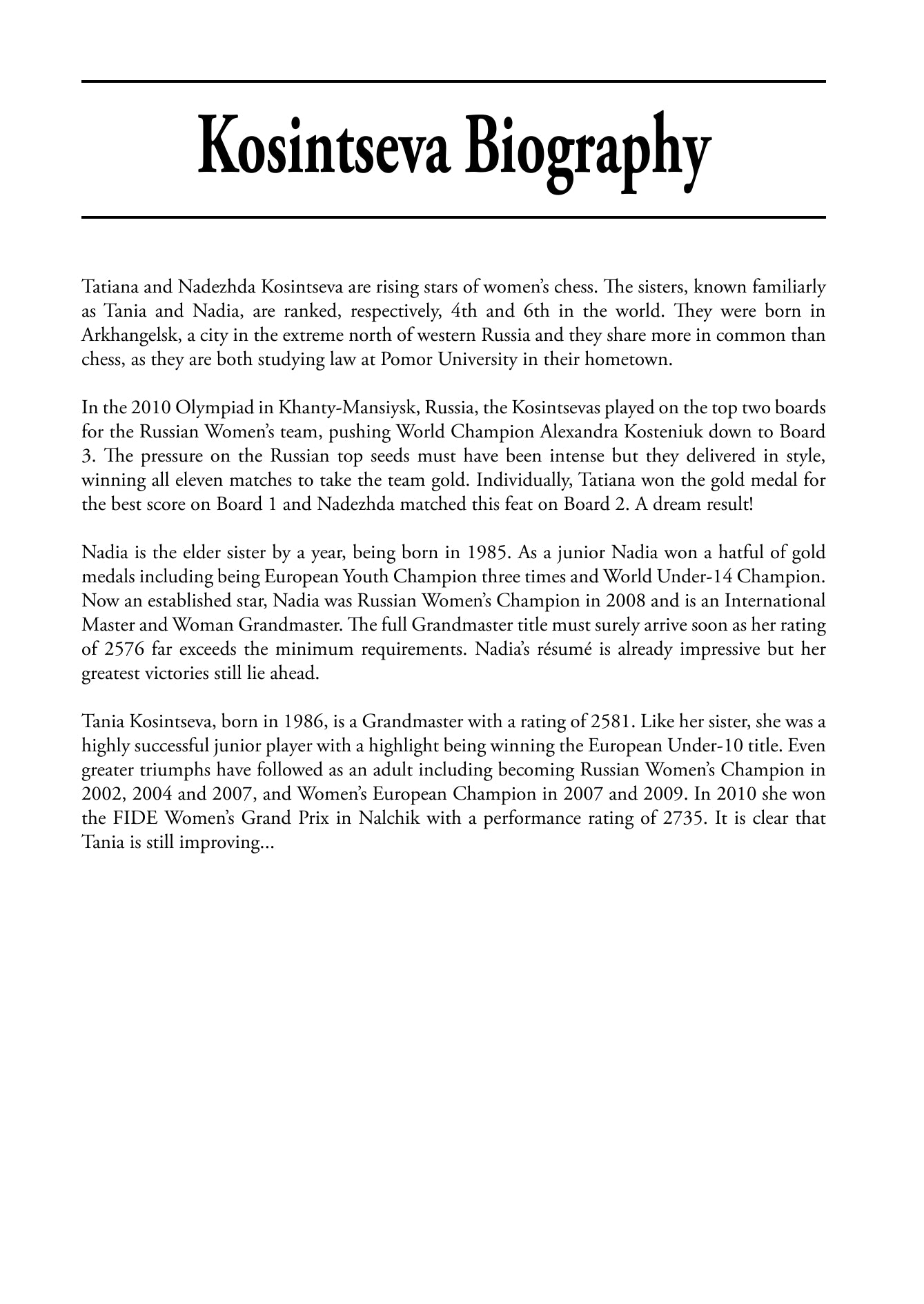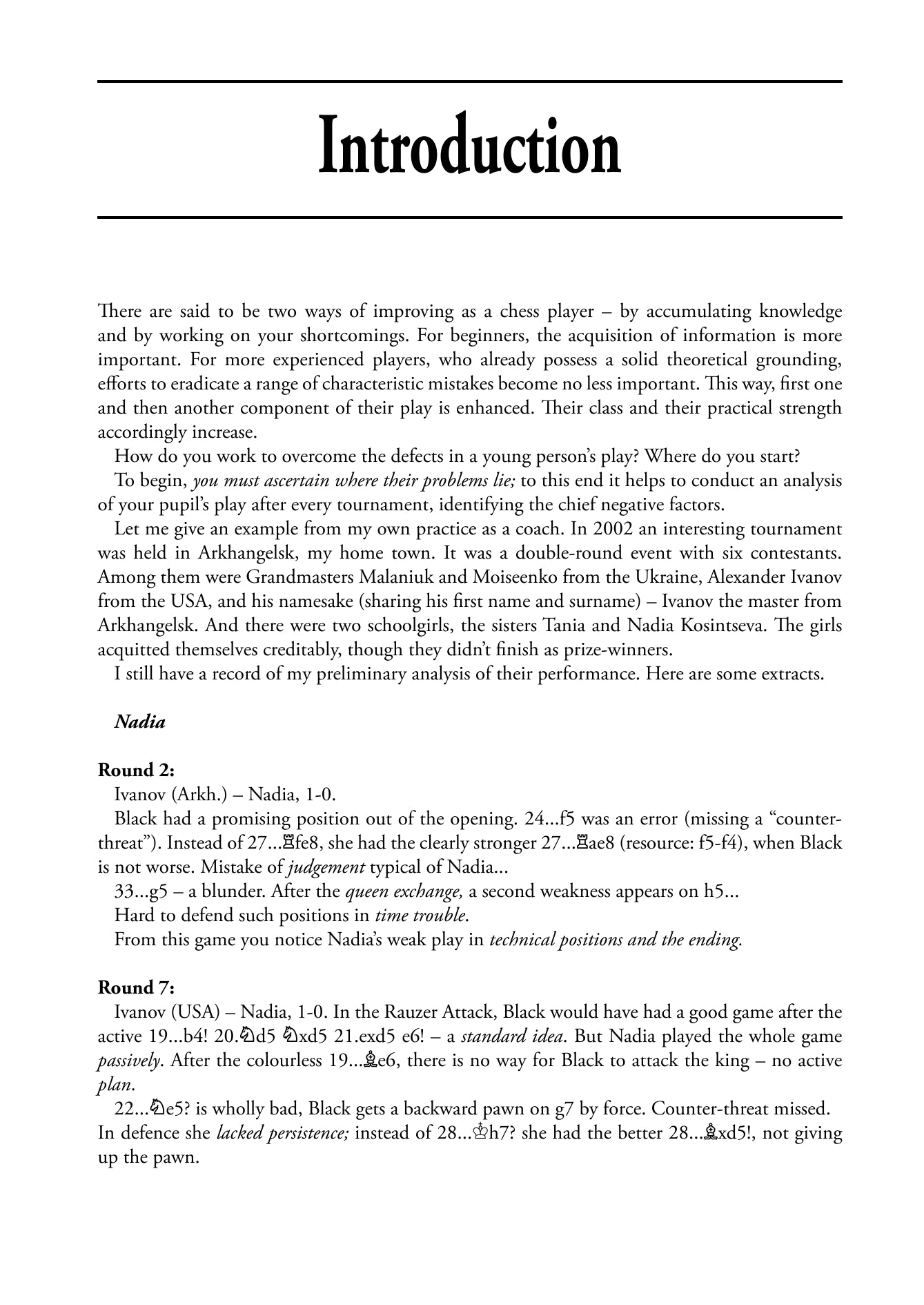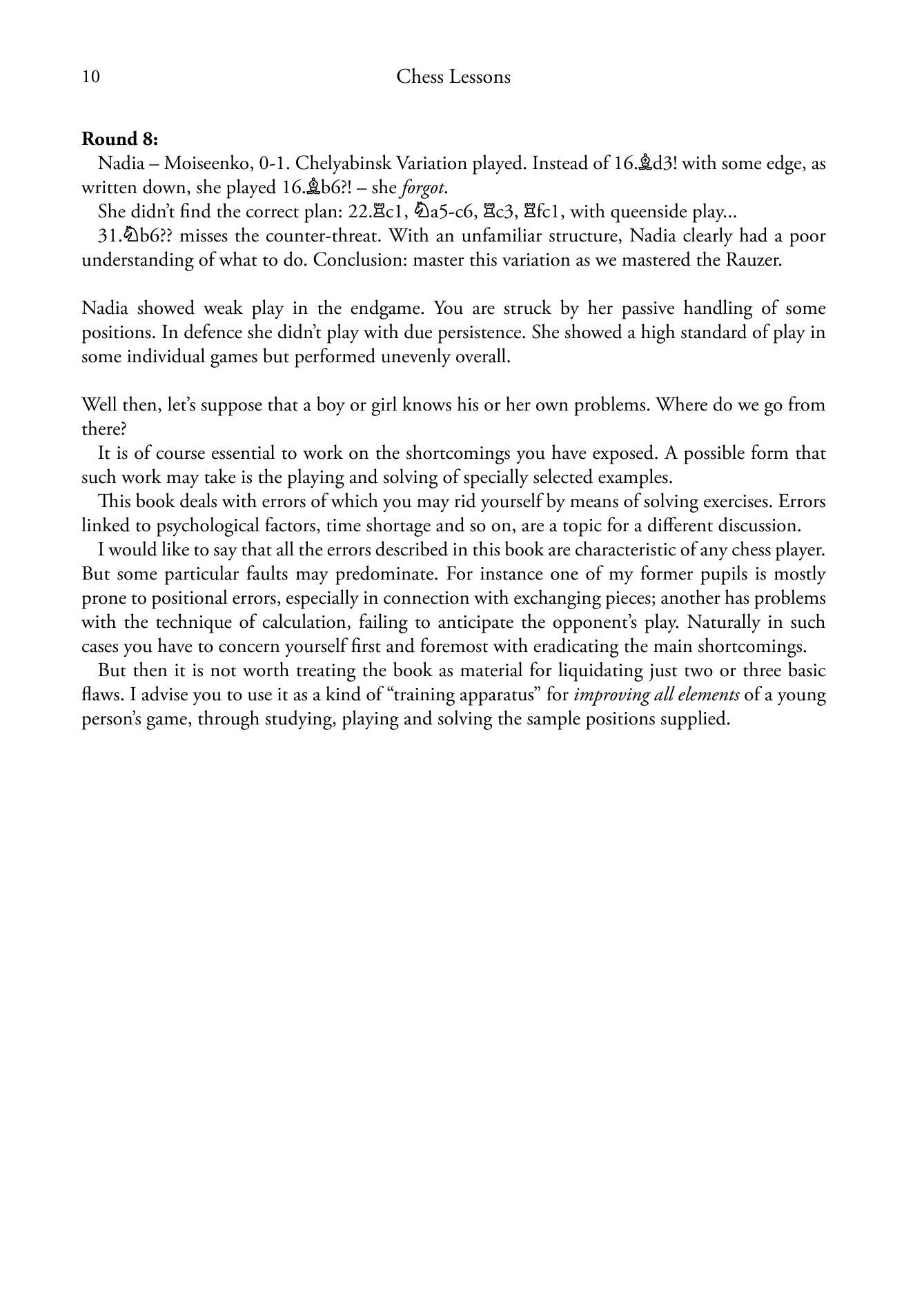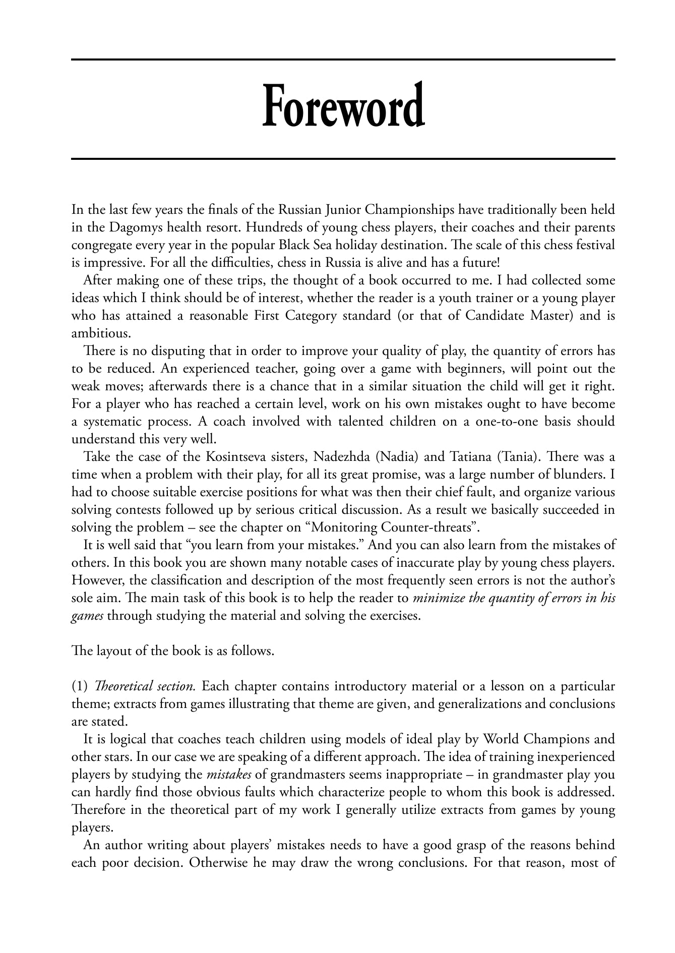 "Nella scuola russa di scacchi (quella inglese è più difficile da definire, a meno che non conti lo svolgimento di tornei nei fine settimana negli istituti scolastici) tali incidenti vengono accuratamente eliminati con programmi di allenamento rigorosi, e questa tecnica è descritta in dettaglio nel libro intitolato Lezioni di scacchi di Vladimir Popov. L'autore segue diverse sue allieve, le più note delle quali sono le sorelle Kosintseva, attualmente al quarto e quinto posto della classifica femminile, mostrando le posizioni di allenamento su cui le ha messe alla prova e frammenti rilevanti delle loro partite. Questo tipo di libro può risultare piuttosto pesante, ma questa interazione ha un certo fascino e rallegra quando i suoi studenti commettono anche molti errori".