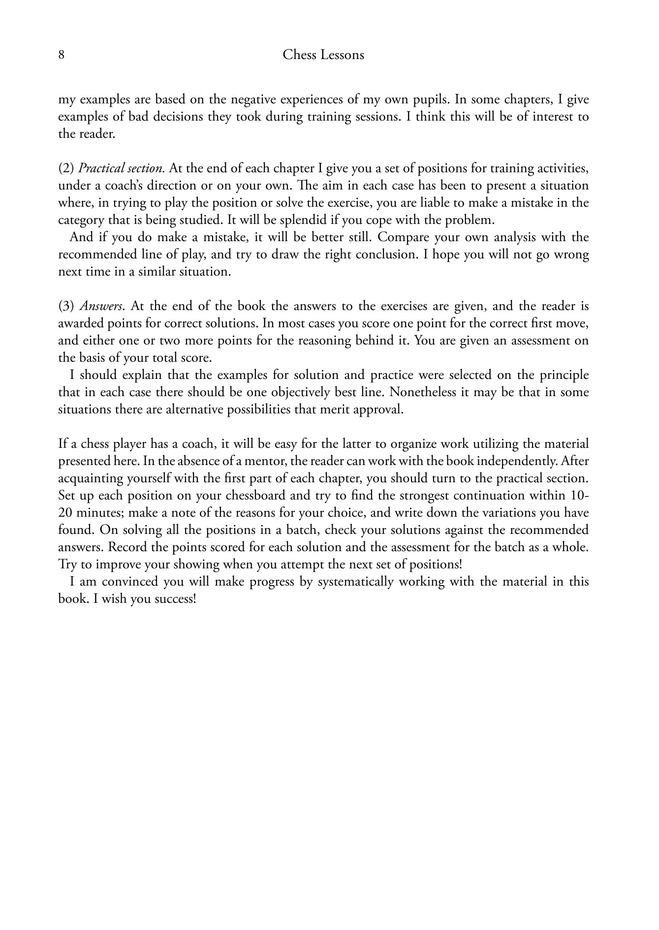 "Il titolo generico Lezioni di scacchi non rende giustizia a questo libro. Popov ha smesso di giocare a vent'anni per dedicare la sua vita allo sviluppo di giovani talenti e ha riflettuto a lungo su come farlo al meglio.... Lezioni di scacchi è un libro eccellente che si rivelerà utile non solo per gli esempi che offre, ma anche per il modo in cui insegna a guardare il gioco. Altamente raccomandato per i giocatori dal 1800 in su".