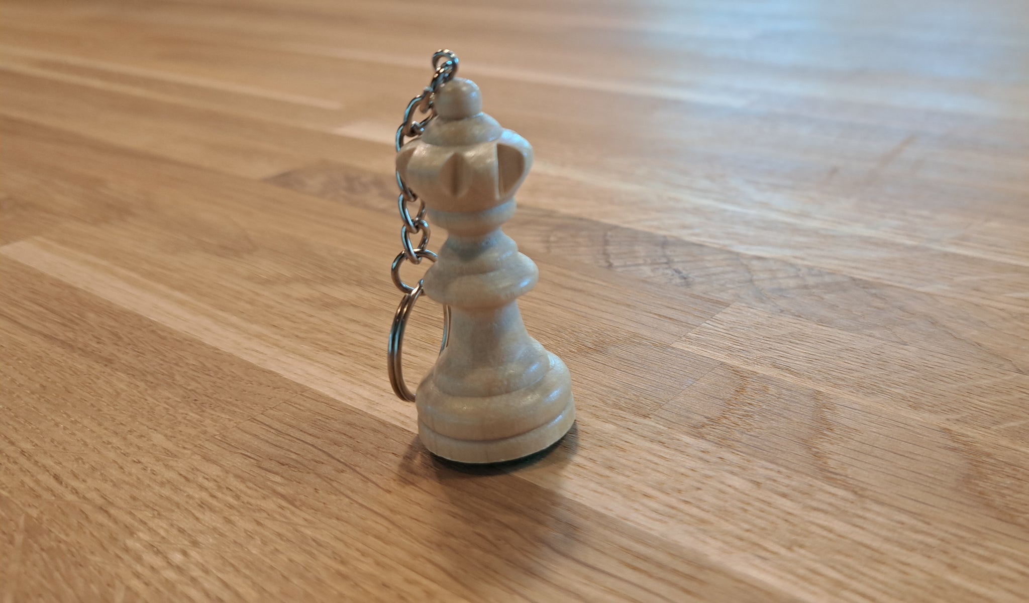 Portachiavi a scacchi in legno con chiusura in metallo. Un gadget scacchistico non solo per i più giovani. Il ciondolo può essere utilizzato come piccolo regalo o come portachiavi. L'offerta riguarda la figura dell'hetman bianco.