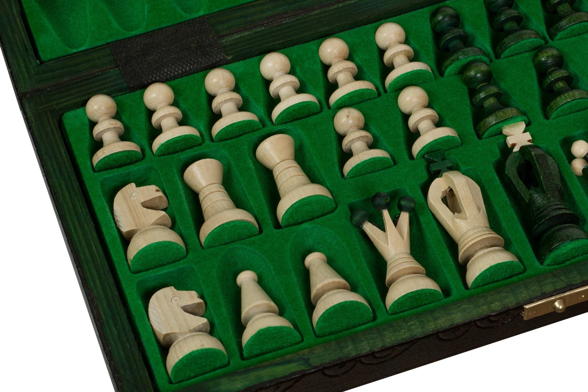 All'interno è presente un inserto per riporre i pezzi. I pezzi sono realizzati in legno di sicomoro . Le caselle scure di questa scacchiera sono di colore Verde Ciliegio. DIMENSIONI DELLA SCACCHIERA: 350x175x50 mm .