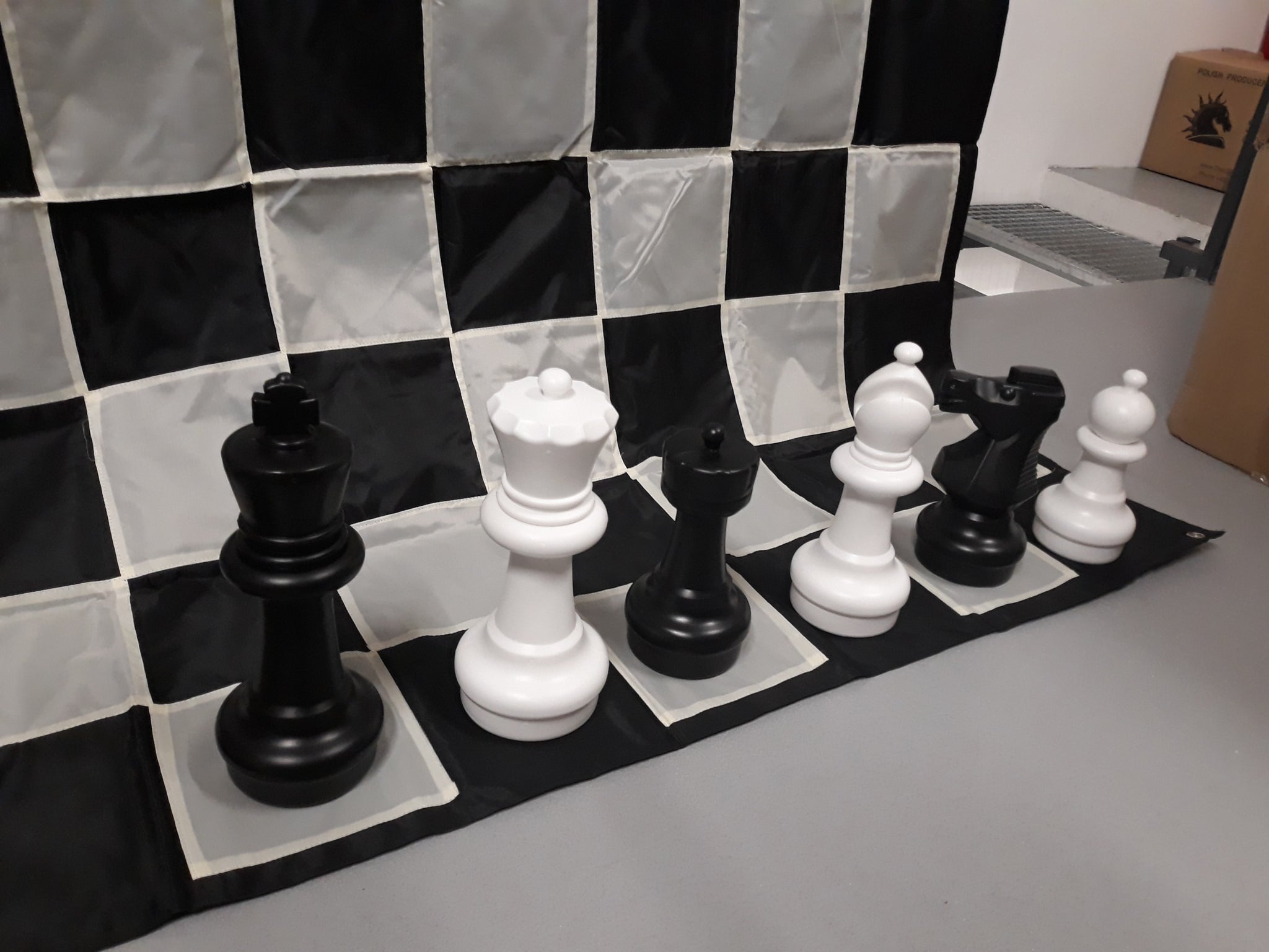 Un set composto da Scacchi di media dimensioni da giardino con un Re alto 30 cm e una scacchiera in nylon con caselle da 15 x 15 cm. I pezzi sono realizzati in PVC durevole e di buona qualità, resistente alla luce del sole e all'acqua.